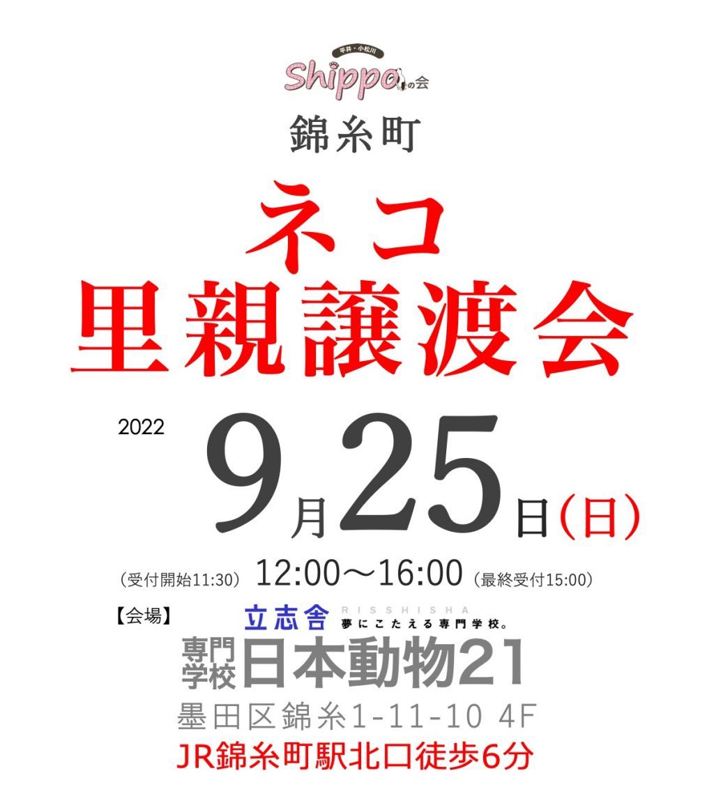 東京 錦糸町の専門学校日本動物21様のご協力により、同校舎にて猫の里親譲渡会を開催させていただきます。