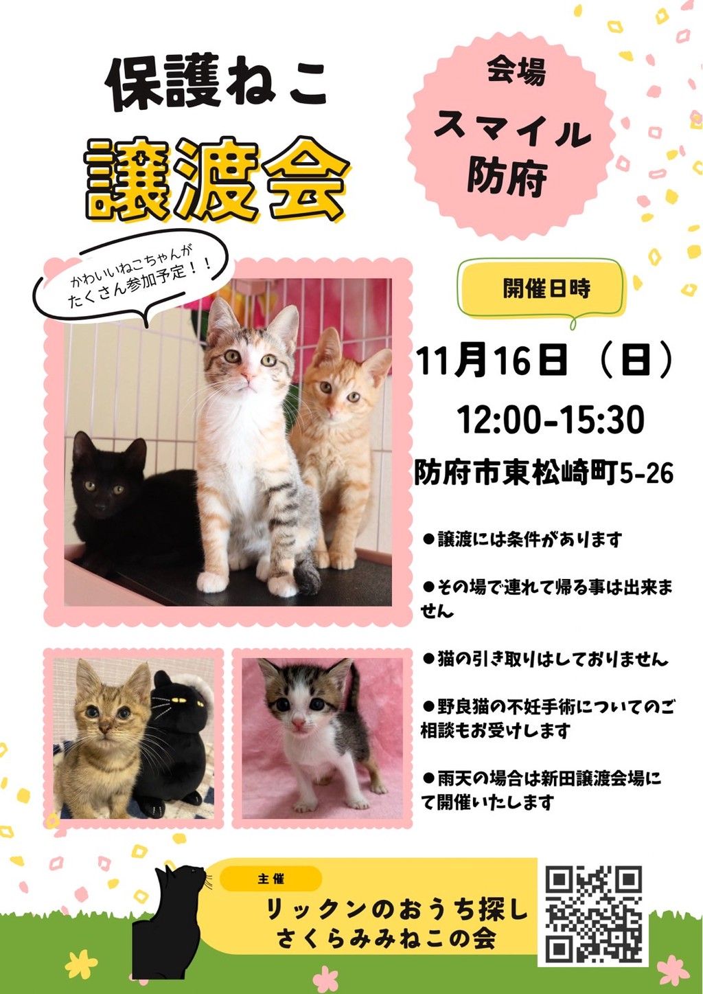 防府市の『スマイルほうふ』で「保護ねこ譲渡会inスマイルほうふ」が開催されます。