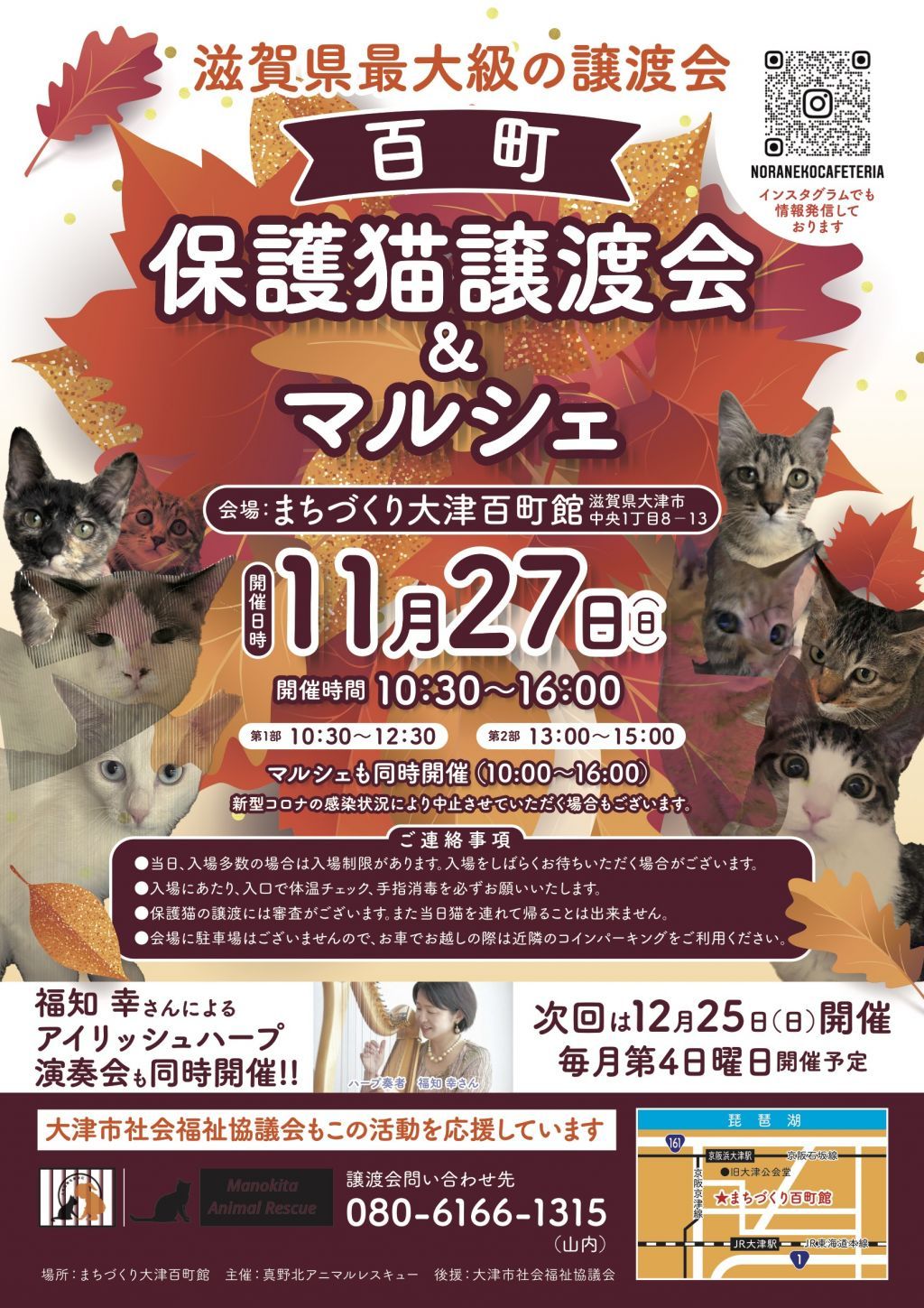滋賀県最大級の保護猫譲渡会。マルシェやアイリッシュハープの生演奏も!毎回50頭以上の猫さんが参加します。初めての方でも安心して譲渡の安心サポートの譲渡会です。予約不要、入場無料。