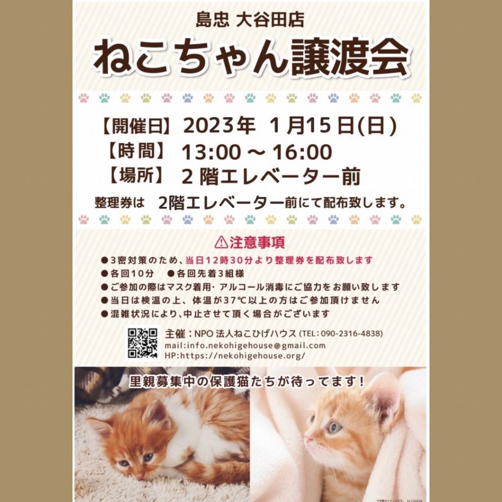 当日の猫の体調などにより参加猫のお休みや変更がある場合があります。