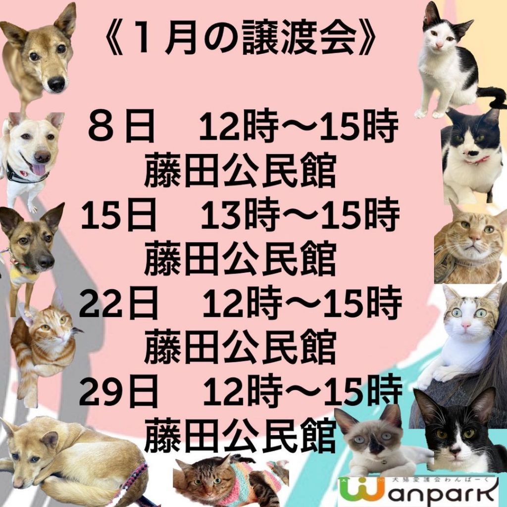 1月8日(日)12-15時、藤田公民館にて犬猫の譲渡会を開催します!