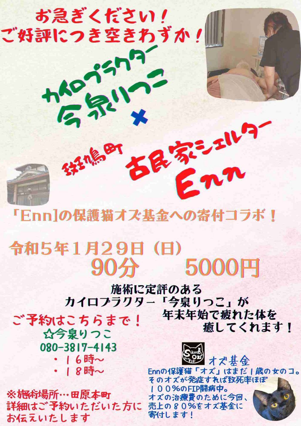 Ennのボランティアでもあるカイロプラクター今泉りつこが施術を致します!本当に身体が軽くなります!ぜひ、この素晴らしい施術を受けてみてください!!売上金の80%をFIPと闘病中の古民家シェルターEnnの保護猫オズに寄付してくださいます。身体を癒して猫助けしてみるのは いかがでしょうか。