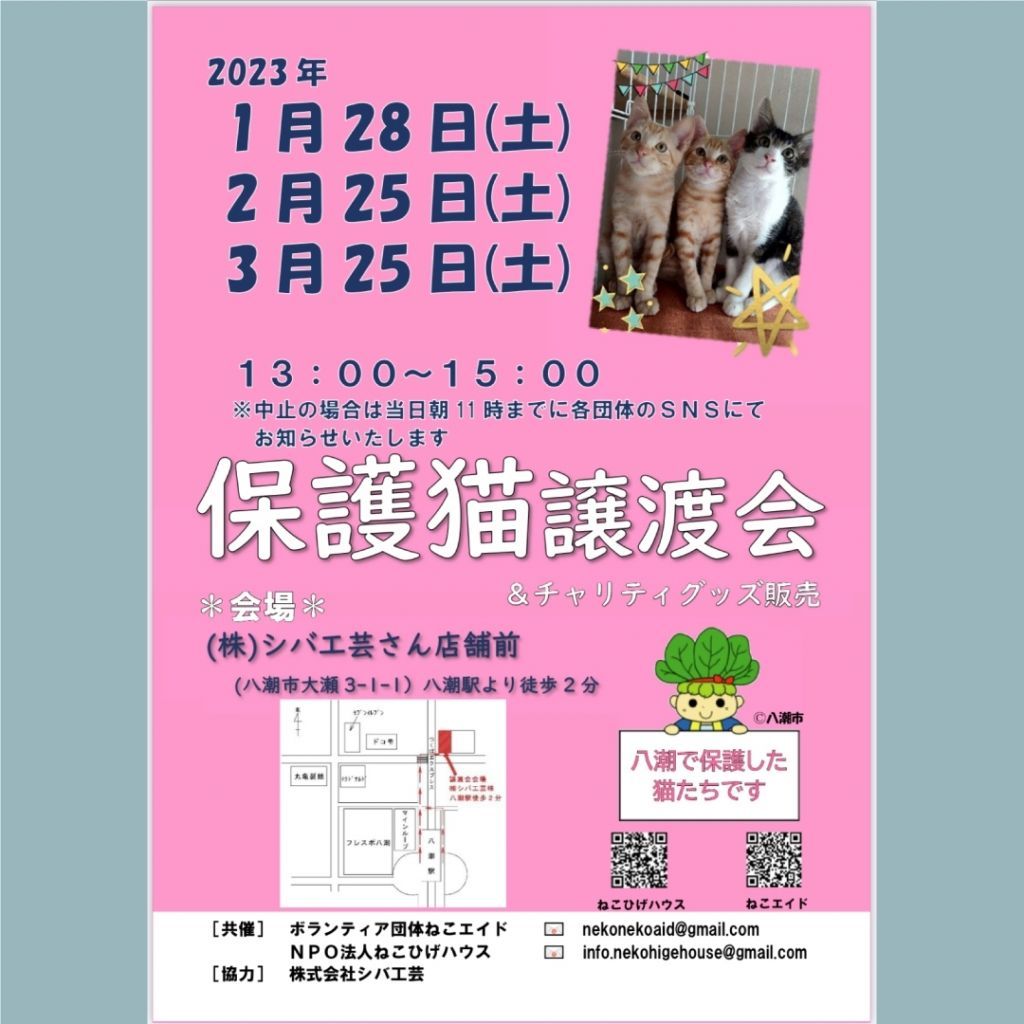 里親の申し込み、チャリティ販売、八潮市の野良猫相談などは受け付けております。