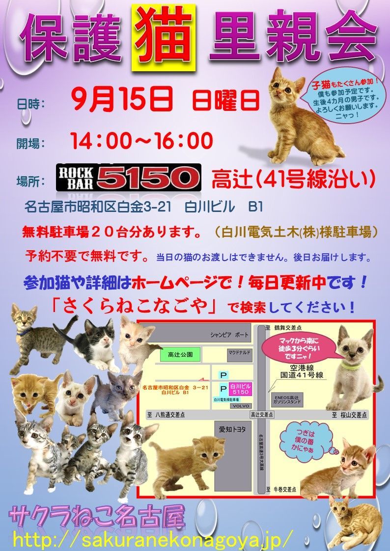 子猫中心の里親会を開催します。 約30匹の保護猫が参加予定です。 予約不要で無料です。無料駐車場20台分あります。 初めて猫を飼われる方もできる限りのサポートをさせていただきます。 参加猫や詳細はホームページでご確認ください!http://sakuranekonagoya.jp/