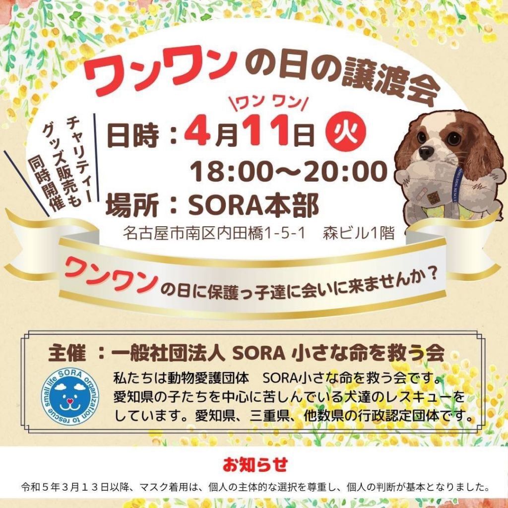 わんわんの日に譲渡会を行います。ぜひ可愛い保護っ子達に会いに来て下さいね。チャリティグッズ販売も同時に開催します。