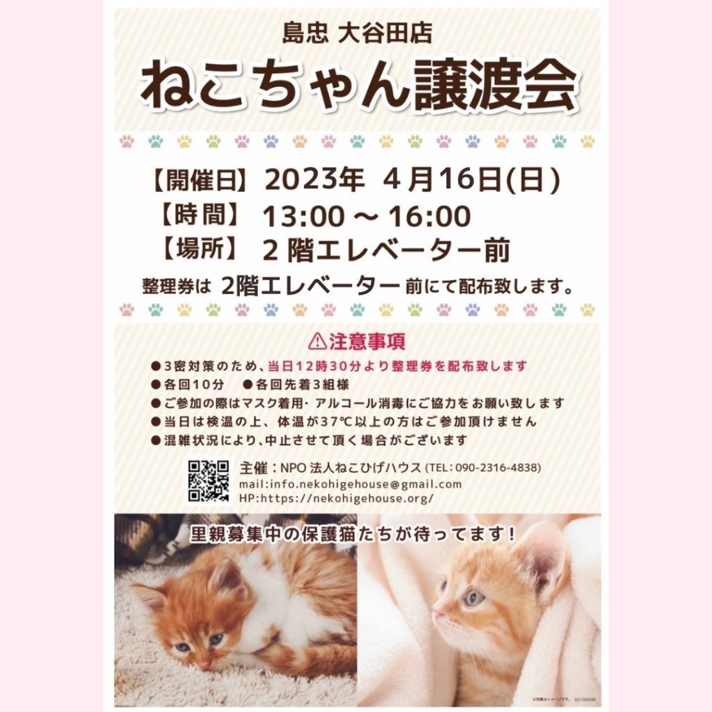 ※整理券が間に合わなかった方は譲渡会ブース内には入れませんが出来る限りのご対応も可能です。スタッフにお声掛けください