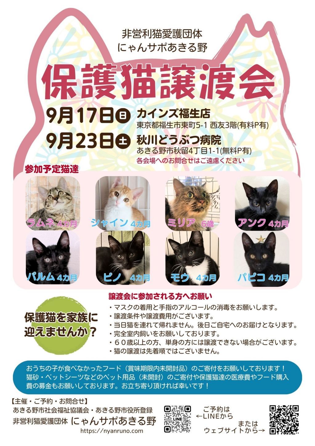 東京都福生市の西友内、カインズ福生店様3階ペットコミュニケーションルーム内にて保護猫譲渡会を開催します!