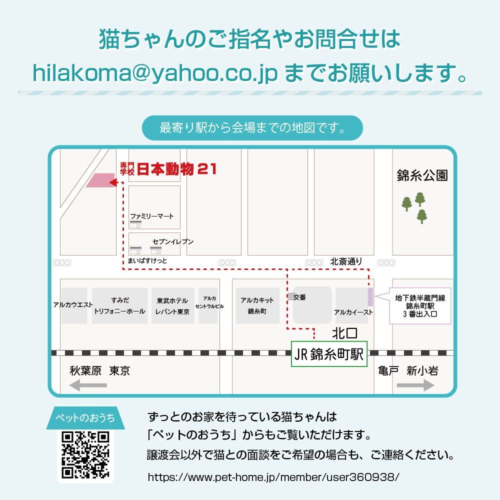 ※東京都墨田区錦糸1-2-1(アルカタワーズ法人本部)は里親譲渡会の会場ではございませんので、お間違いのないよう御願い致します。