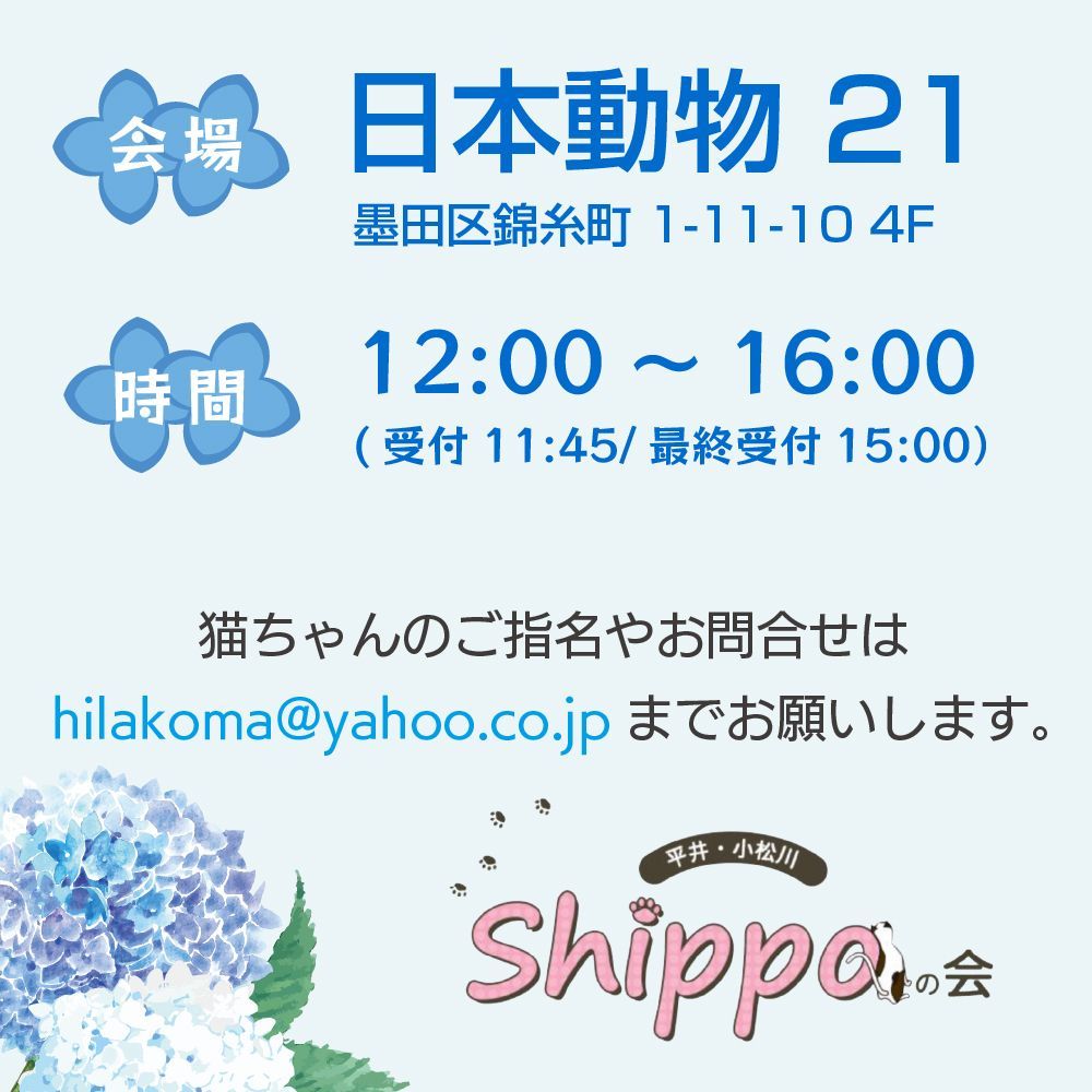※日本動物21様は譲渡会の会場をお貸して頂いているだけですので、里親会・お見合い等に関する一切の問い合わせは受け付けておりません。
