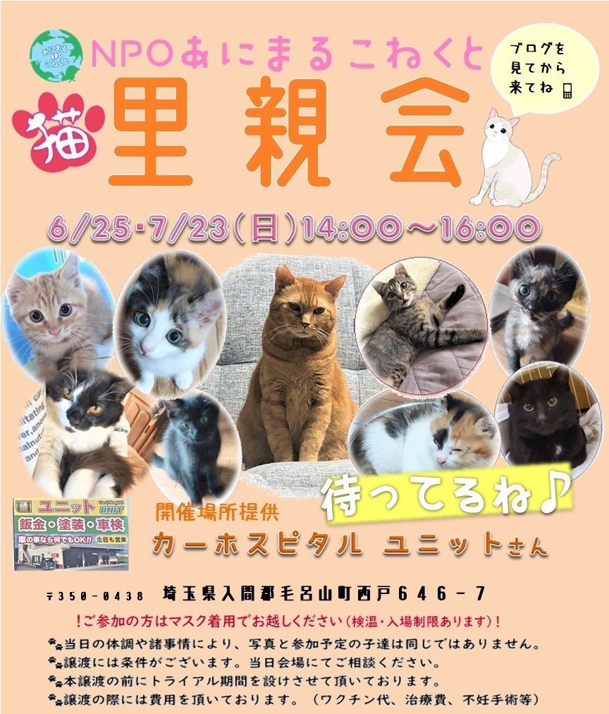 生後2~3カ月の子猫から成猫ちゃんまで参加します!グッズ販売もあります♪※先着順ではなく里親会後に協議してより良い条件のご家族を選定させて頂いておりますので、お時間早い方が有利という事はありません^^