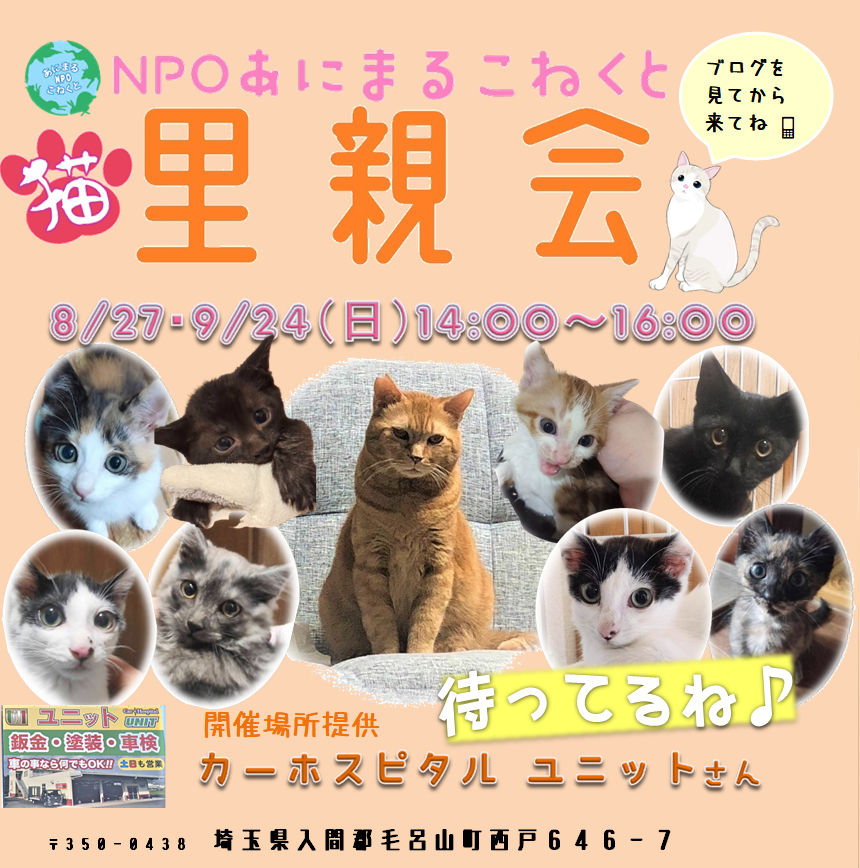 今回は、生後6カ月未満の子猫達がたくさんいます!!!是非お越しください☆彡グッズ販売もあります♪※先着順ではなく里親会後に協議してより良い条件のご家族を選定させて頂いておりますので、お時間早い方が有利という事はありません^^