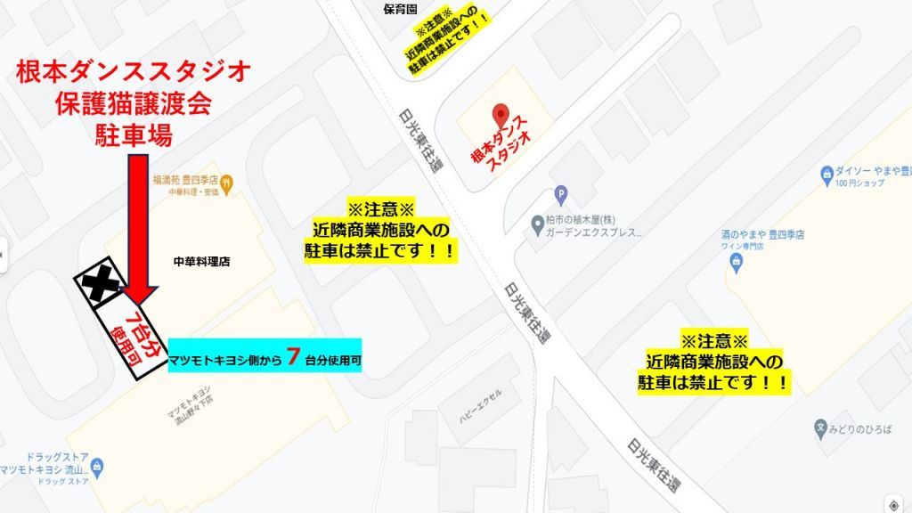 ◎駐車場でのトラブルにつきましては 自己責任とし、Withねこ及び根本ダンススタジオは