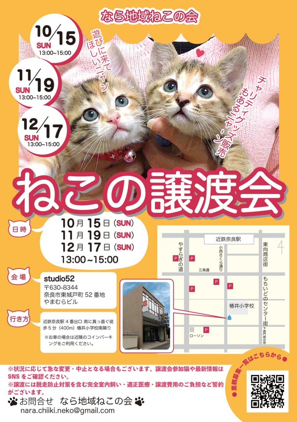 毎月奈良市ならまちにて猫の譲渡会を行っております。