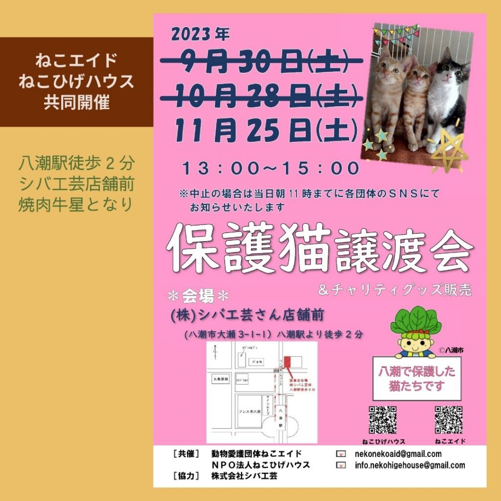 里親の申し込み、チャリティ販売、八潮市の野良猫相談などは受け付けております。