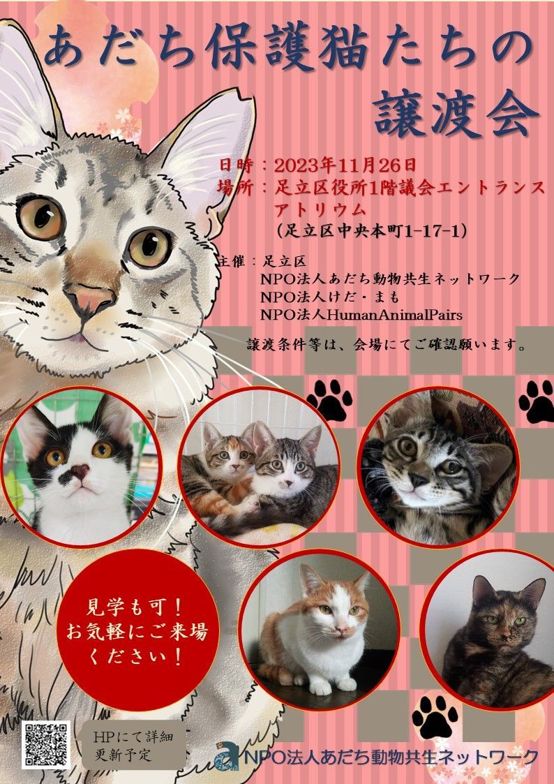 NPO法人あだち動物共生ネットワークさん主催の【あだち保護猫たちの譲渡会】に参加します。