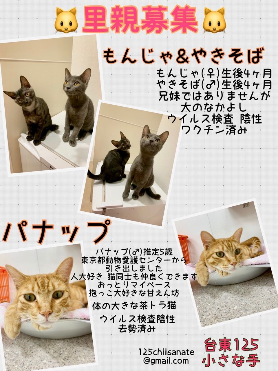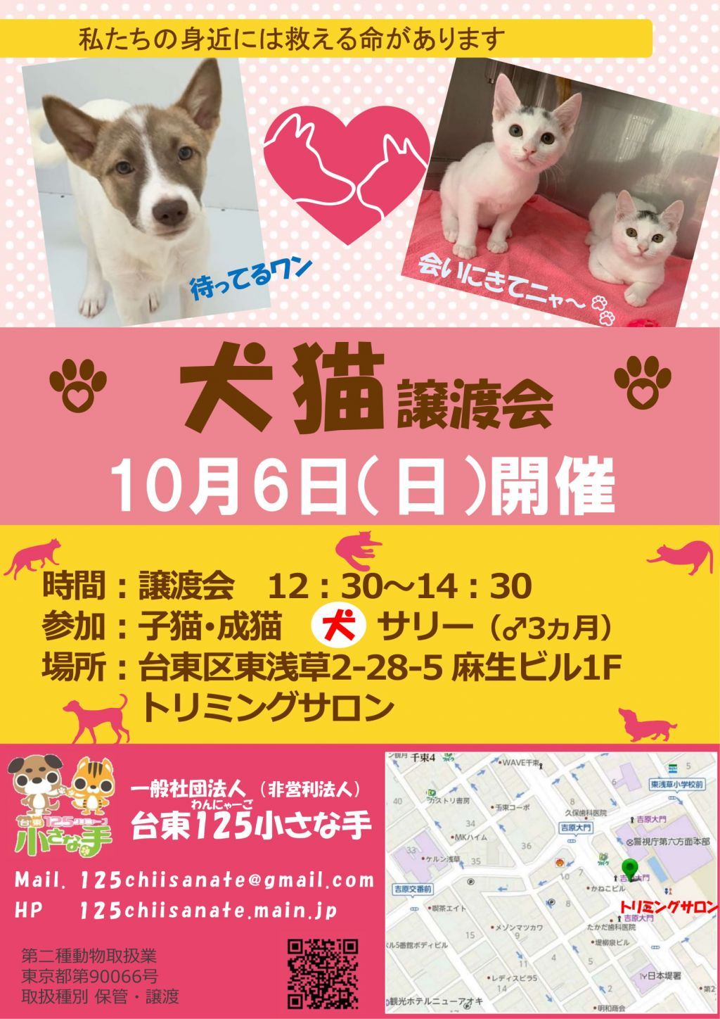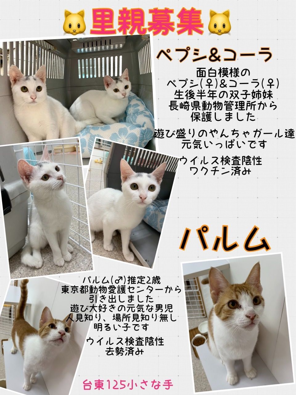 開催時間 12:30~14:30参加予定 子猫・成猫、犬(サリー)譲渡会数日前に、参加メンバーをブログで発表します。http://125chiisanate.blog.fc2.com/事前のご予約は不要です。ぜひご家族皆さまでお越しください!