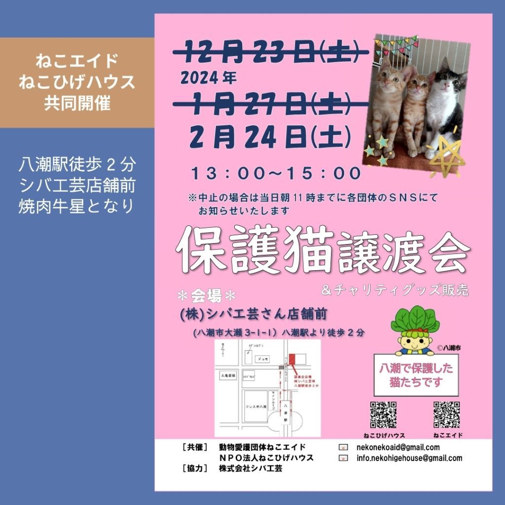 里親の申し込み、チャリティ販売、八潮市の野良猫相談などは受け付けております。