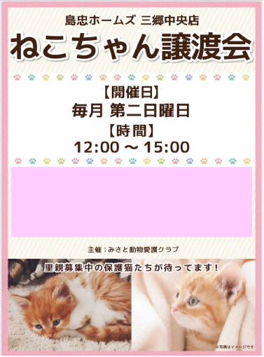 保護猫の譲渡会です。毎月第二日曜日に開催しています。参加費無料です。https://ameblo.jp/misato-doubutu-aigo-club/