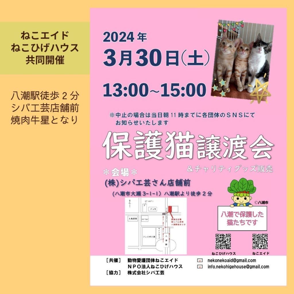 里親の申し込み、チャリティ販売、八潮市の野良猫相談などは受け付けております。