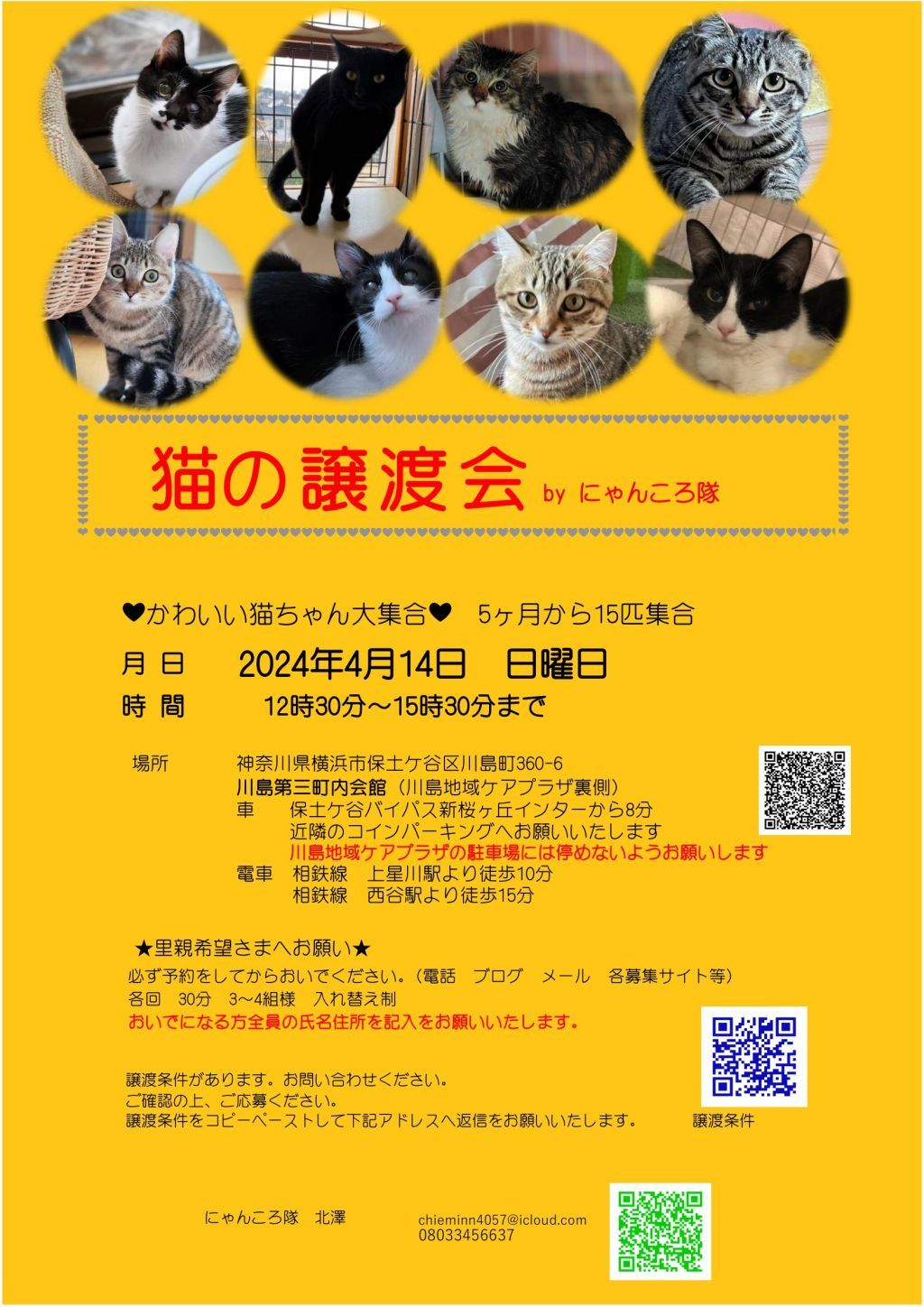 双方の条件が合った場合は譲渡会又は保護先にお見合にきていだだき成立後に自宅室内へお届けいたします。