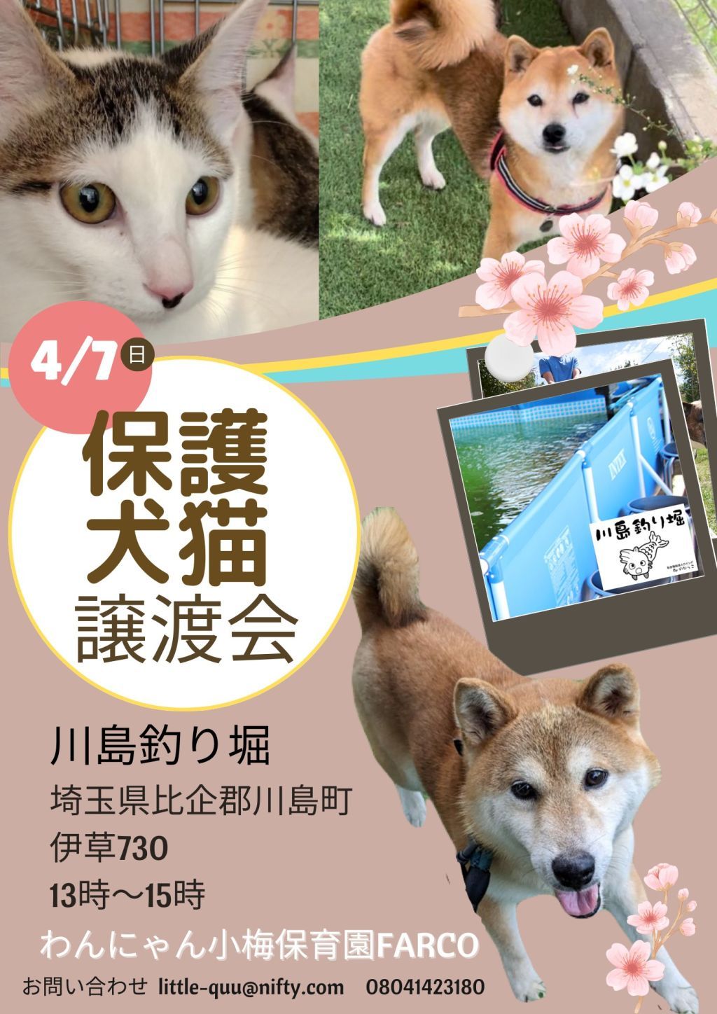 保護犬保護猫里親会川島釣り堀もわんちゃん連れて是非遊びに来てくださいチャリティーマルシェも開催します