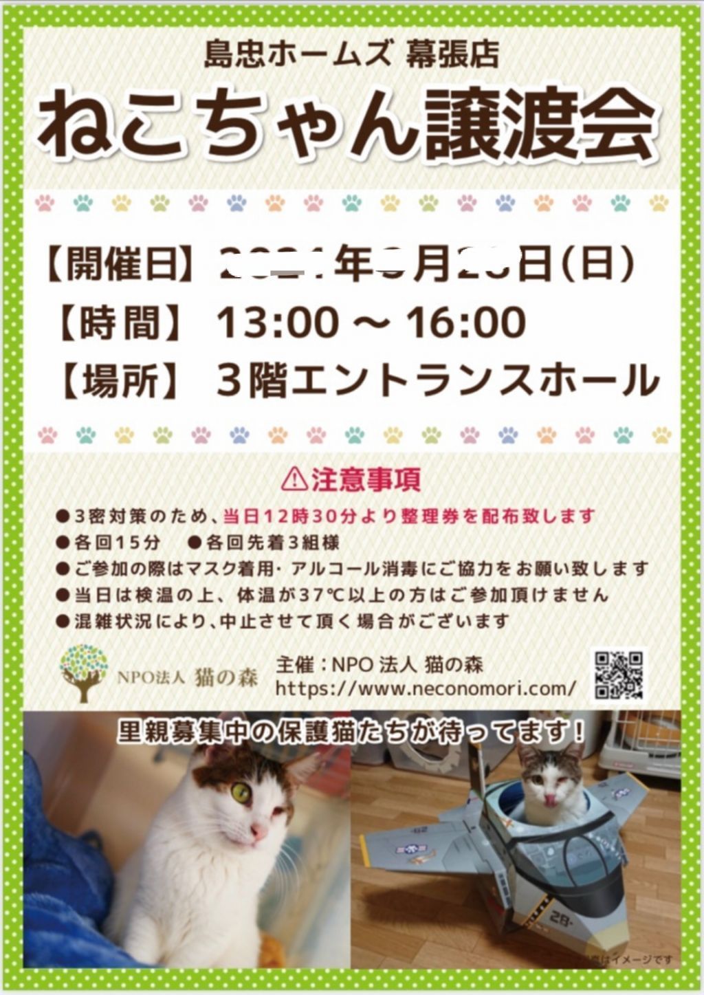 NPO法人猫の森が主催する保護猫の譲渡会。新しい家族を待つ多数の猫ちゃんが参加します。予約も可能です。皆様のご参加お待ちしております!●猫の森公式サイトhttps://www.neconomori.com/https://ameblo.jp/yukikosuita/entry-12720543923.html