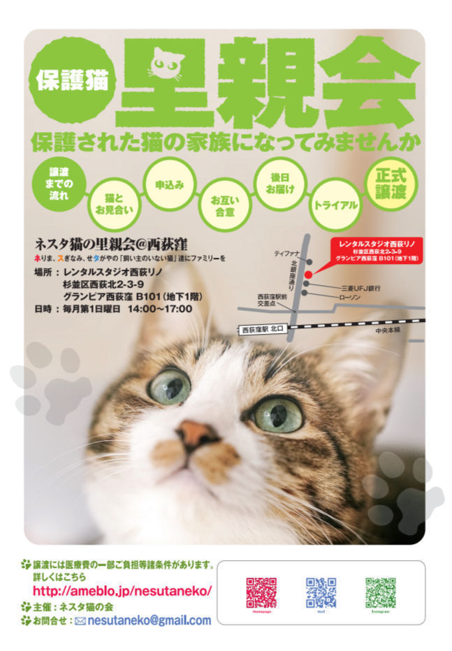 練馬区、杉並区、世田谷区で保護された猫および東京都動物愛護相談センターより引き取った猫達の譲渡会です。