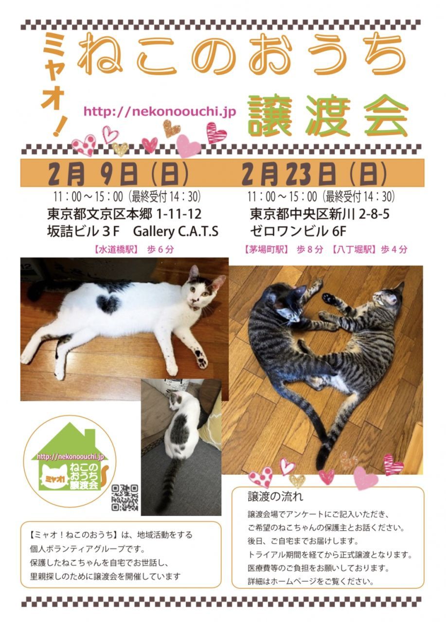 譲渡までの流れ、譲渡時のお願い、医療費の一部ご負担などは、ホームページでご確認いただけます。http://nekonoouchi.jp/