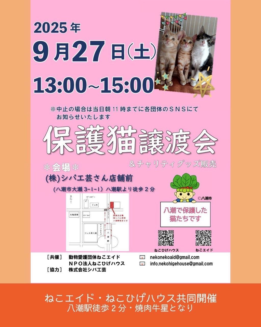 里親の申し込み、チャリティ販売、八潮市の野良猫相談などは受け付けております。