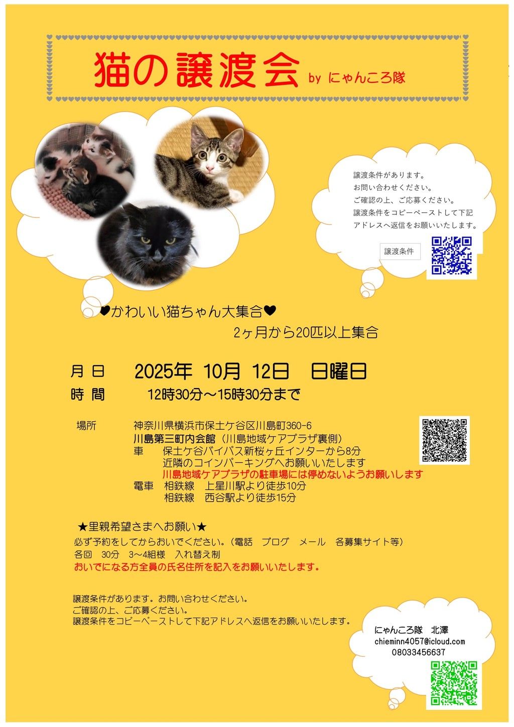 双方の条件が合った場合は譲渡会又は保護先にお見合にきていだだき成立後に自宅室内へお届けいたします。