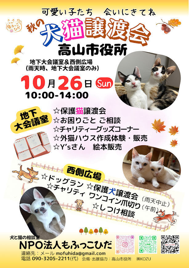 保護猫譲渡会・お困りごとご相談・チャリティーグッズコーナー・外猫ハウス作成体験・販売・Y’sさん絵本販売・ドッグラン・保護犬譲渡会・チャリティワンコイン爪切り・しつけ相談など、もりだくさんです🌟
