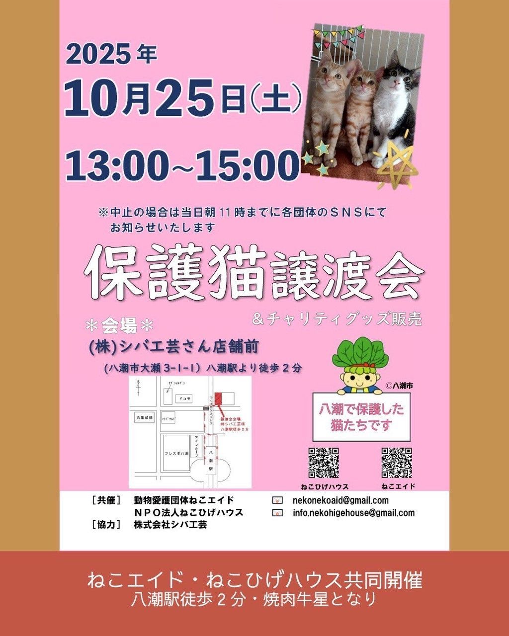 里親の申し込み、チャリティ販売、八潮市の野良猫相談などは受け付けております。
