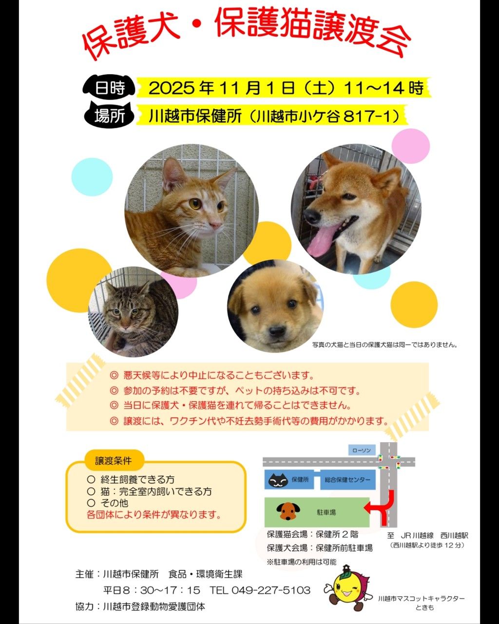 川越市保健所において、登録動物愛護団体のご協力のもと「保護犬・保護猫」の譲渡会を開催します。