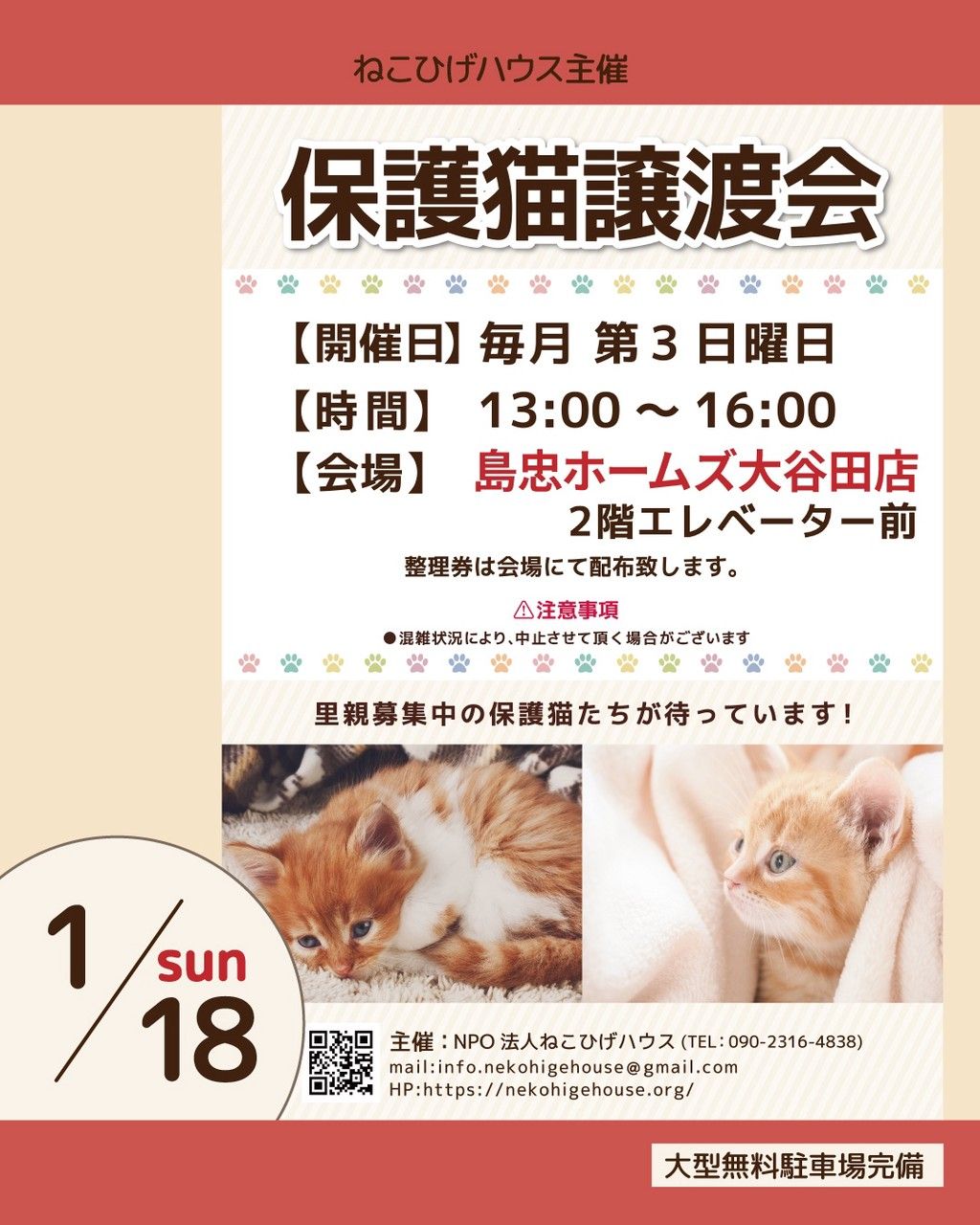 事前にお問い合わせいただき当日は猫を見るだけなども可能です。譲渡会に参加する猫たちは日にちが近くなりましたら、ねこひげハウスのSNSでお知らせを出させていただきます。気になる猫がいましたらお問合せください。