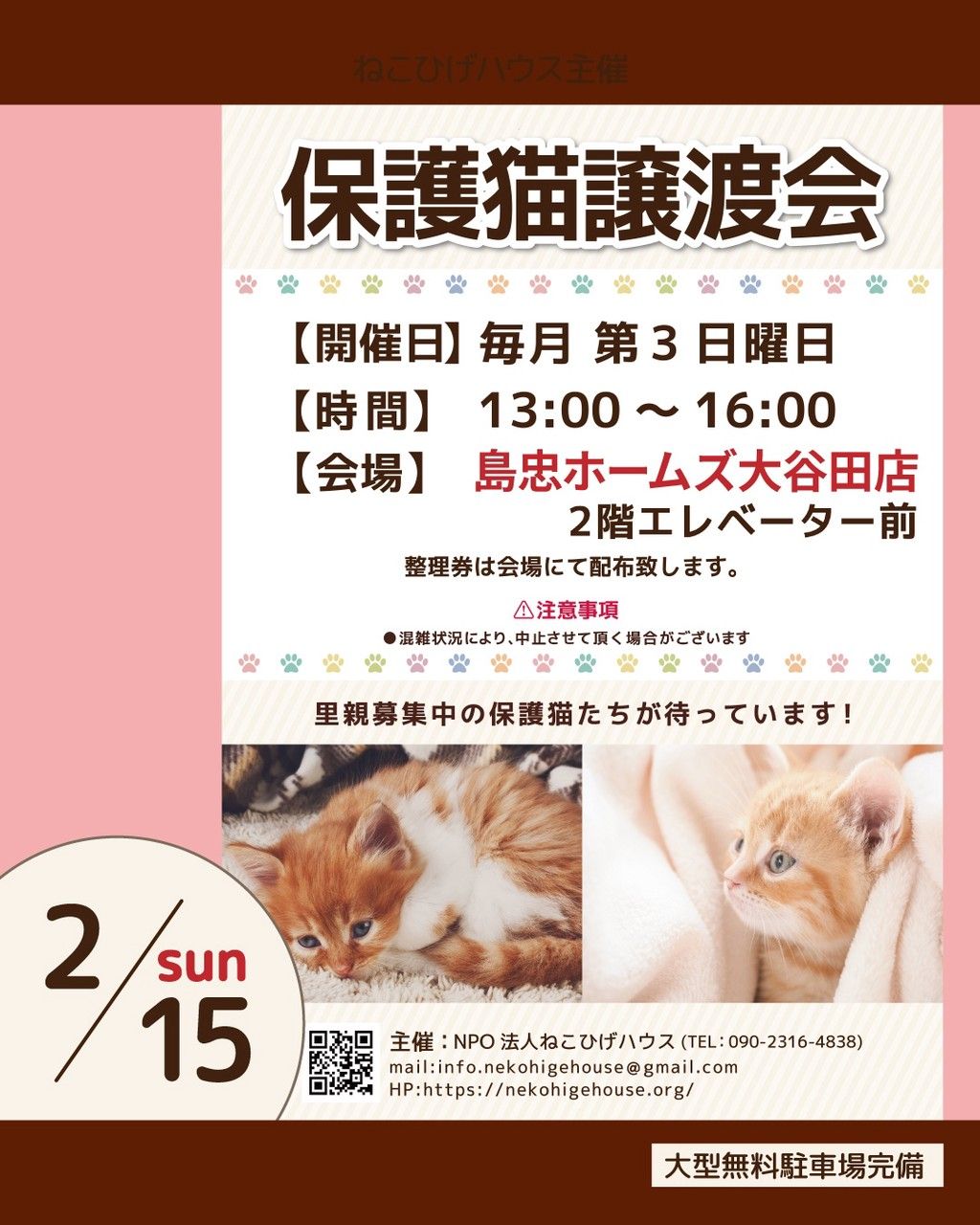 事前にお問い合わせいただき当日は猫を見るだけなども可能です。譲渡会に参加する猫たちは日にちが近くなりましたら、ねこひげハウスのSNSでお知らせを出させていただきます。気になる猫がいましたらお問合せください。