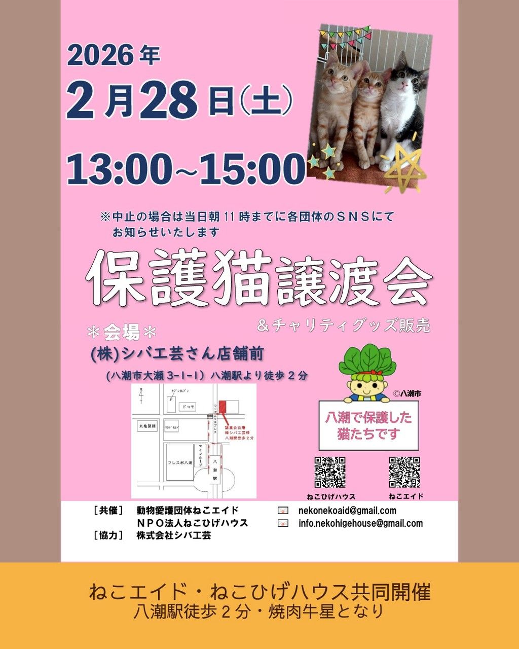 里親の申し込み、チャリティ販売、八潮市の野良猫相談などは受け付けております。