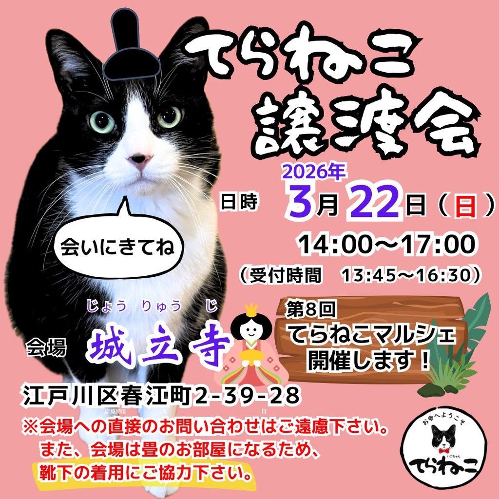 てらねこ譲渡会は、江戸川区支援ボランティアが運営を担い、区外の保護主にも門戸を開き、季節のお花に囲まれた美しいお寺、城立寺様のご協力の下、開催しています。