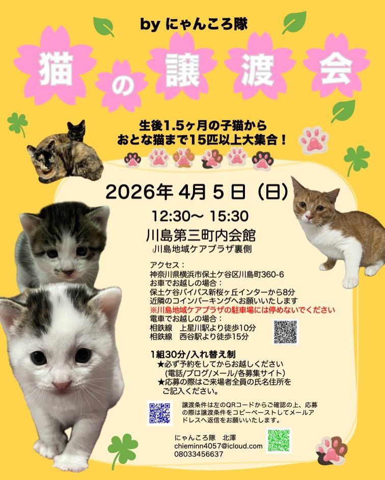 双方の条件が合った場合は譲渡会又は保護先にお見合にきていだだき成立後に自宅室内へお届けいたします。