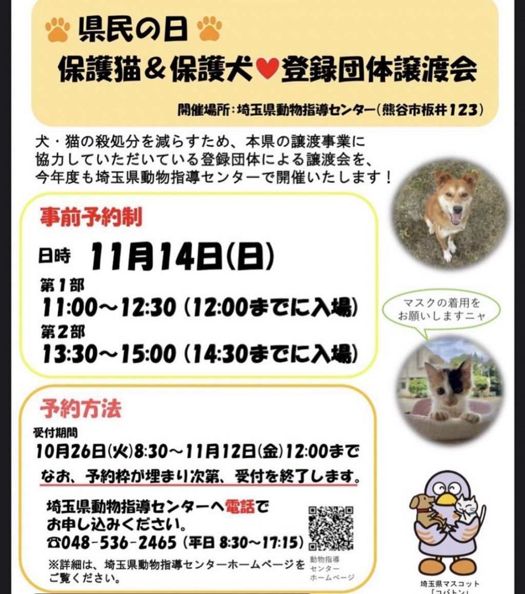 埼玉県の動物指導センター主催の譲渡会です、完全予約制となっておりますので、動物指導センターへ電話でご予約ください。