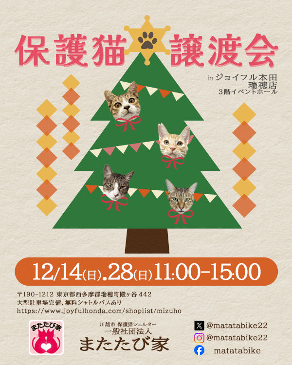・保護猫の体調、悪天候や不測の事態により、予告なく開催が中止、もしくは時間短縮になる場合がございます。
