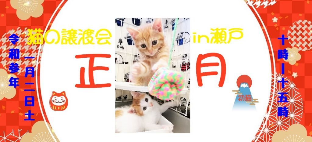 新春2021年1月2日(第1土曜)&9日(第2土曜)&23日(第4土曜)の10時~15時に、瀬戸市内にて『初猫!保護猫の譲渡会』を開催します!!