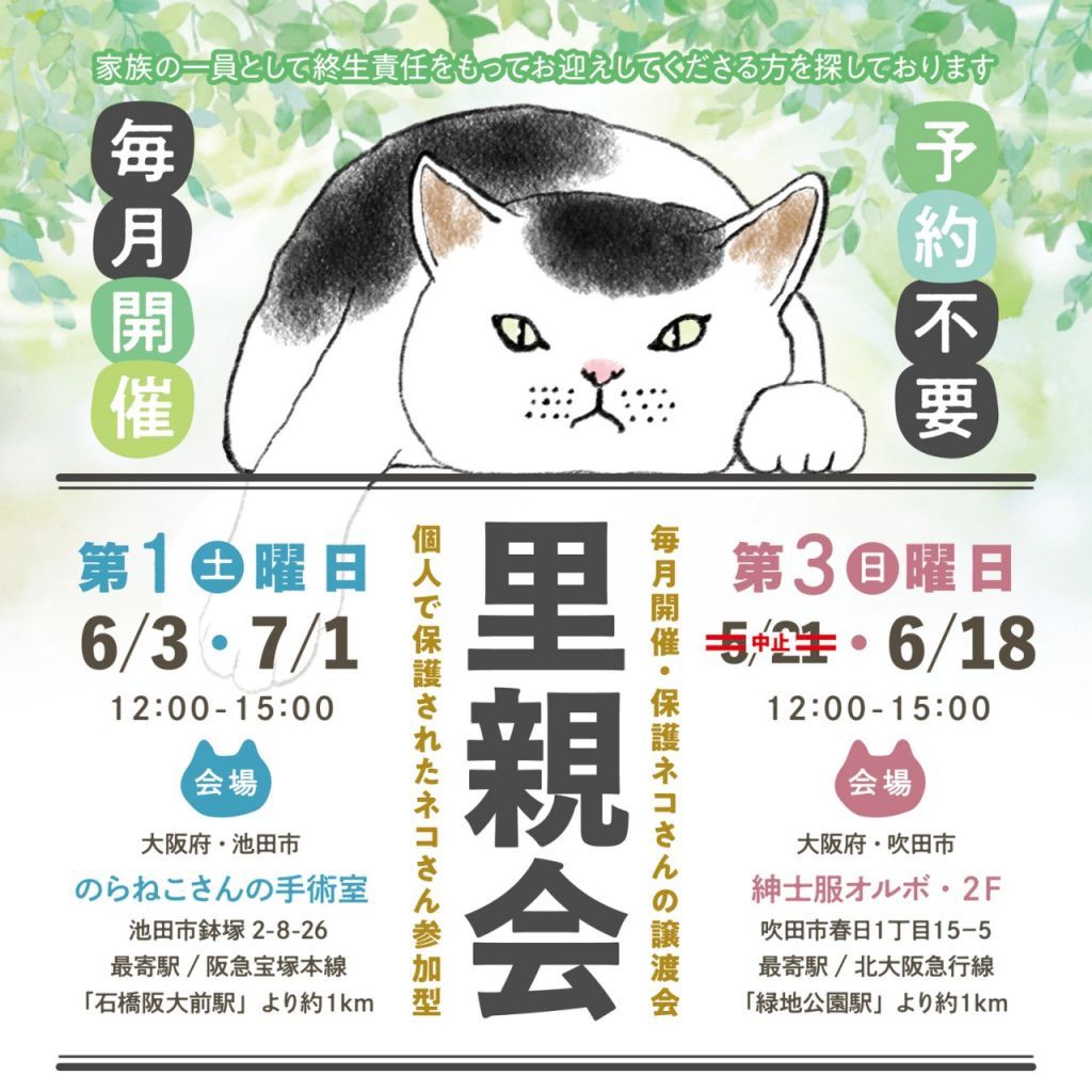 定期的(毎月第3日曜日)に開催している里親会です。参加予定のネコさんは個人で保護猫活動をされている保護ネコさんの参加もあります^^