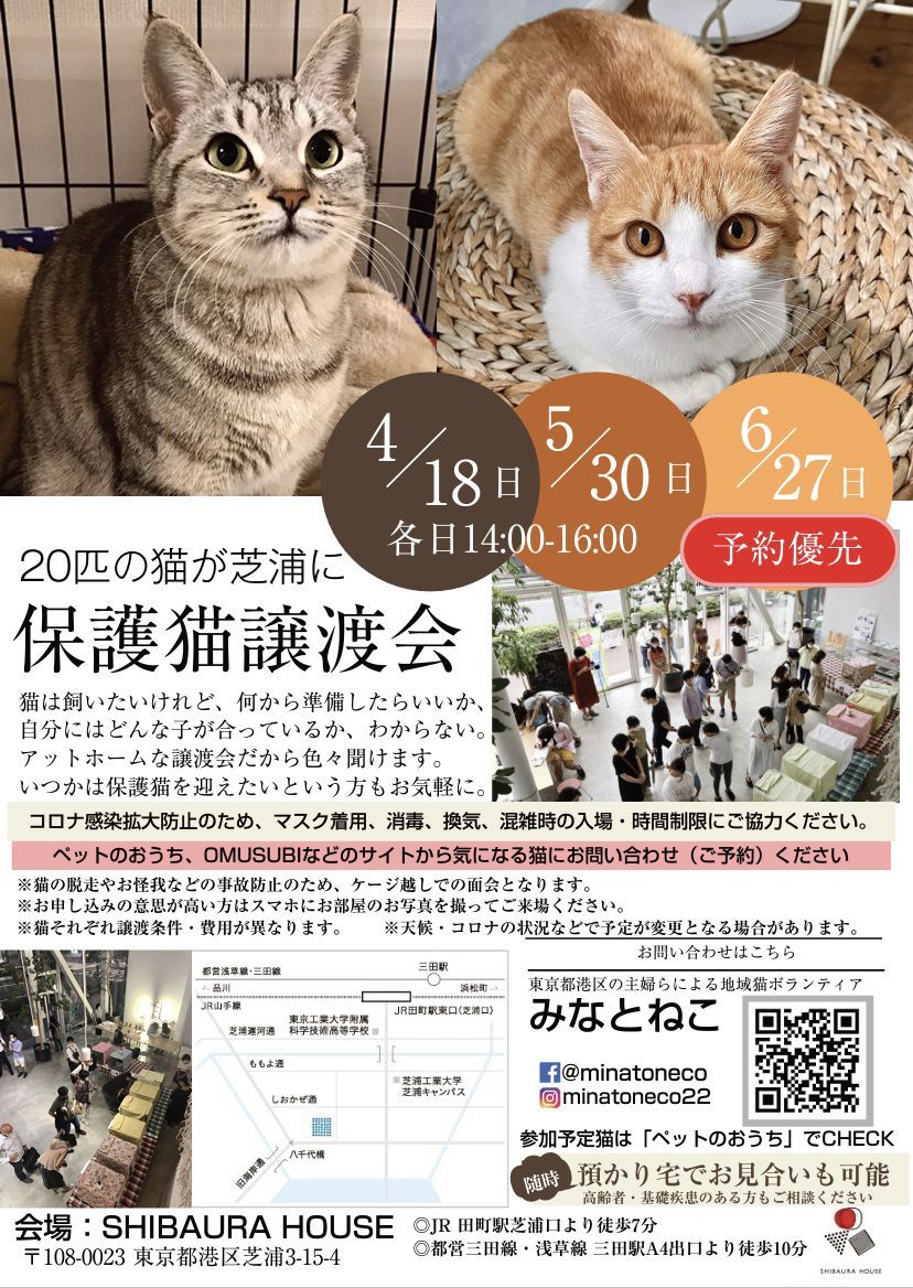 東京都港区で2020年も184匹の譲渡を行なった、みなとねこが田町駅芝浦口で譲渡会を開催します。