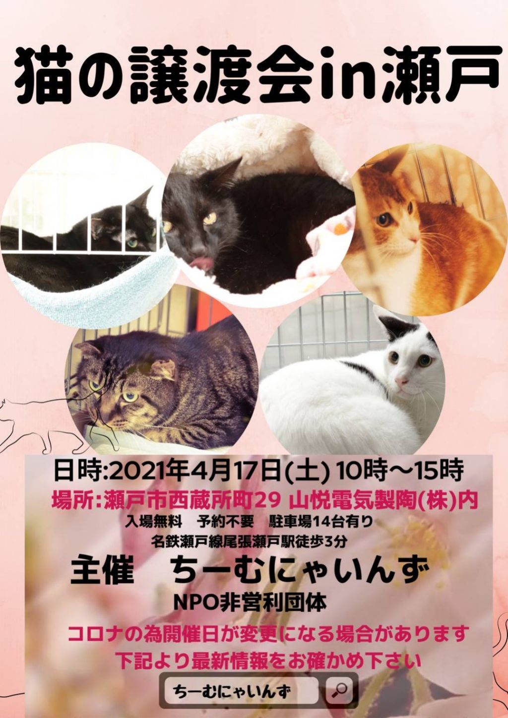 2021年4月17日(第3土曜)の10時~15時に、瀬戸市西蔵所町29山悦電機製陶(株)にて、『保護猫の譲渡会』を開催します!!