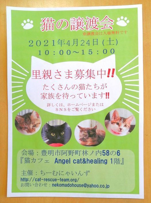 現在のところ、主に瀬戸市内中心部と豊明市内で保護猫の譲渡会を定期開催致しておりますが、愛知・岐阜・三重を中心にした中部地方全域にその活動エリアを拡大中ですので、少し離れた方でも全然OKです!