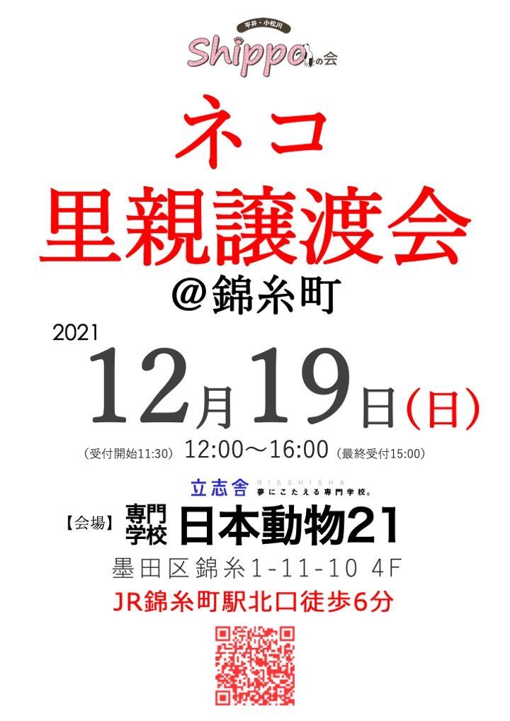 東京 錦糸町の専門学校日本動物21様のご協力により、同校舎にて猫の里親譲渡会を開催させていただきます。