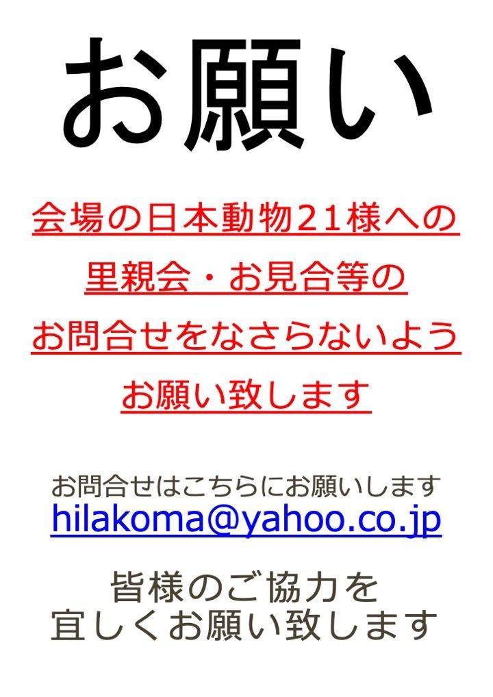 日本動物21様は譲渡会の会場をお貸して頂いているだけですので、里親会・お見合い等に関する一切の問い合わせは受け付けておりません。