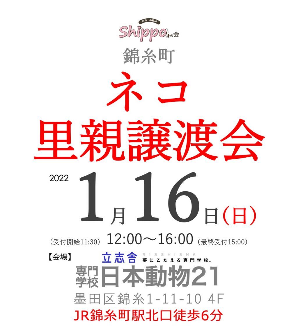 東京 錦糸町の専門学校日本動物21様のご協力により、同校舎にて猫の里親譲渡会を開催させていただきます。