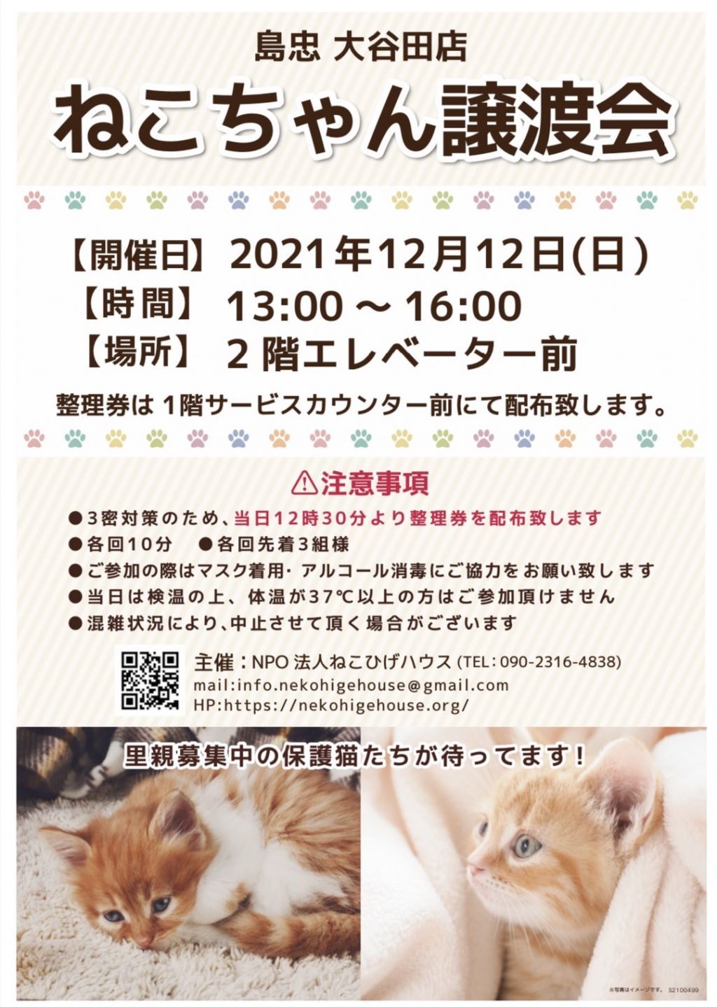 長らく中止となっておりました島忠大谷田店での譲渡会が再開となりました!!