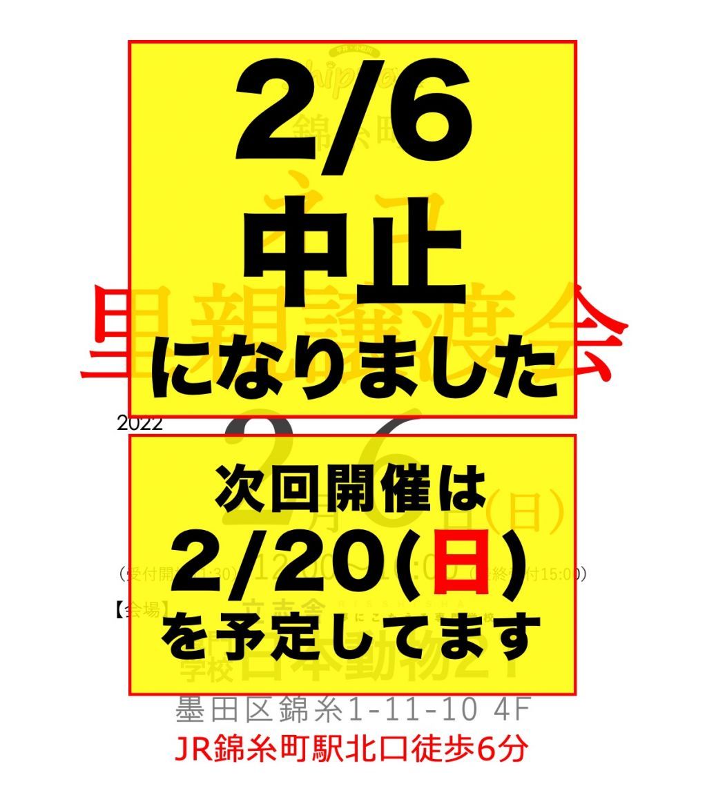 《2/6の東京 錦糸町の専門学校日本動物21様での譲渡会は中止になりました》
